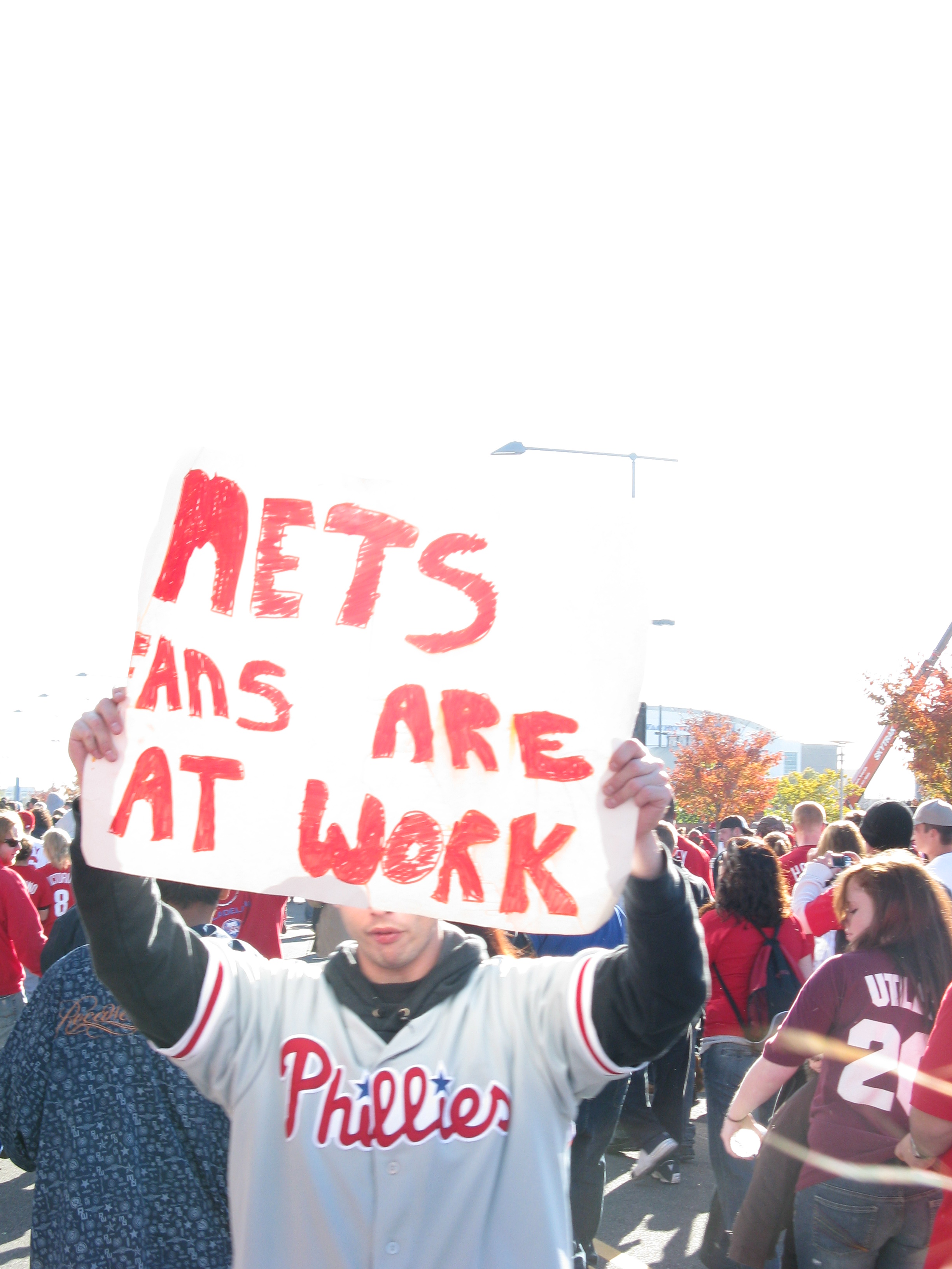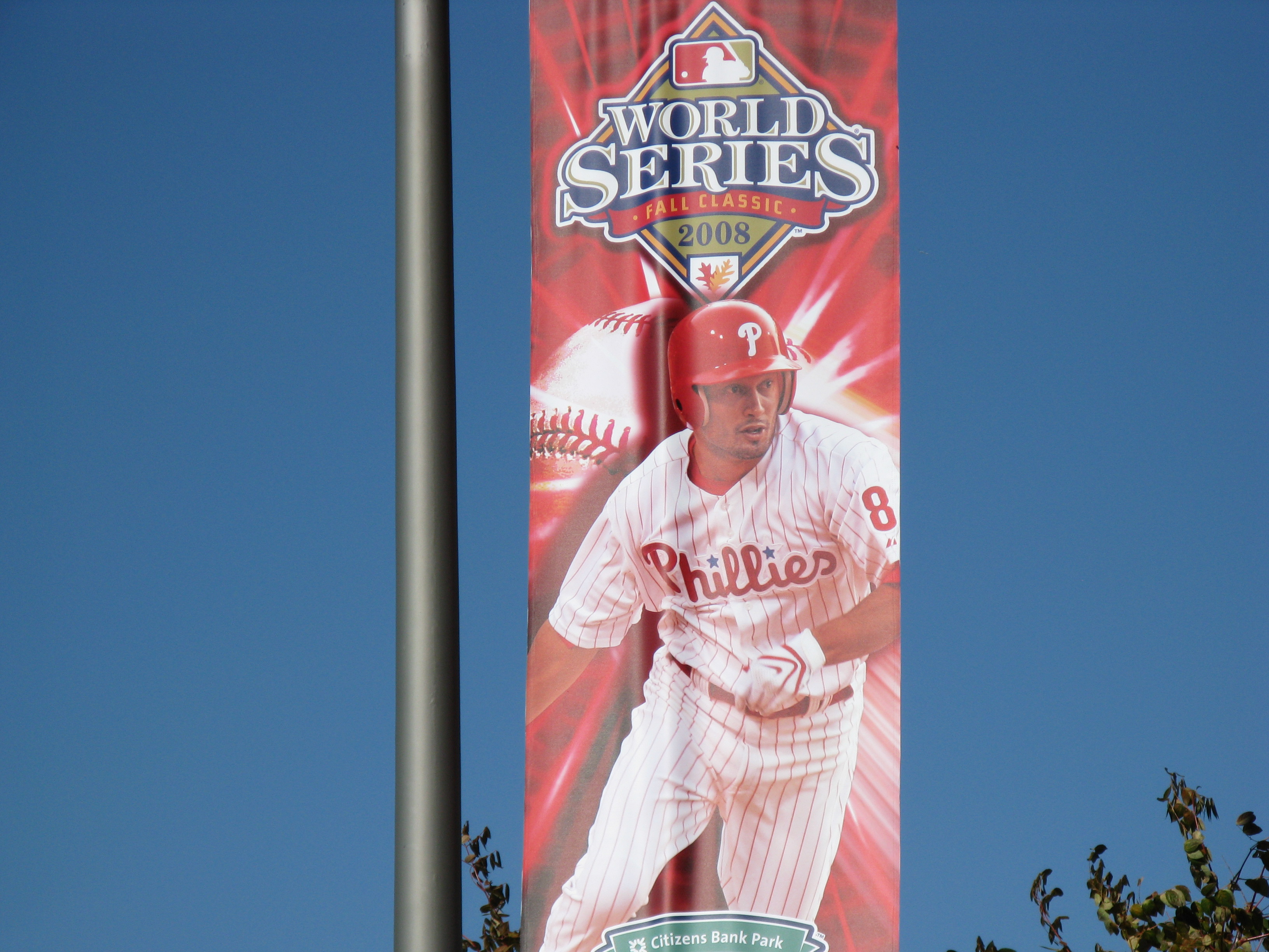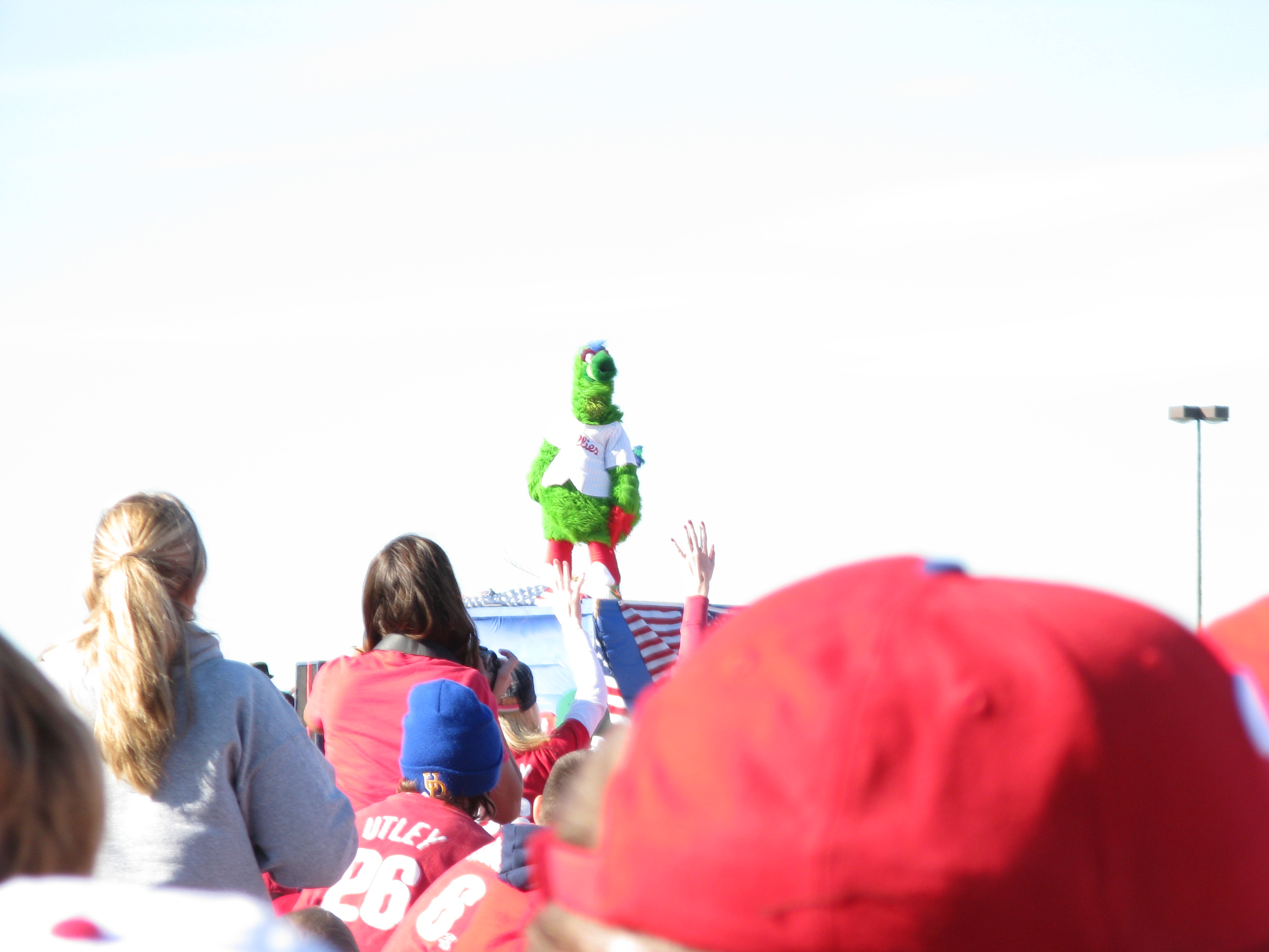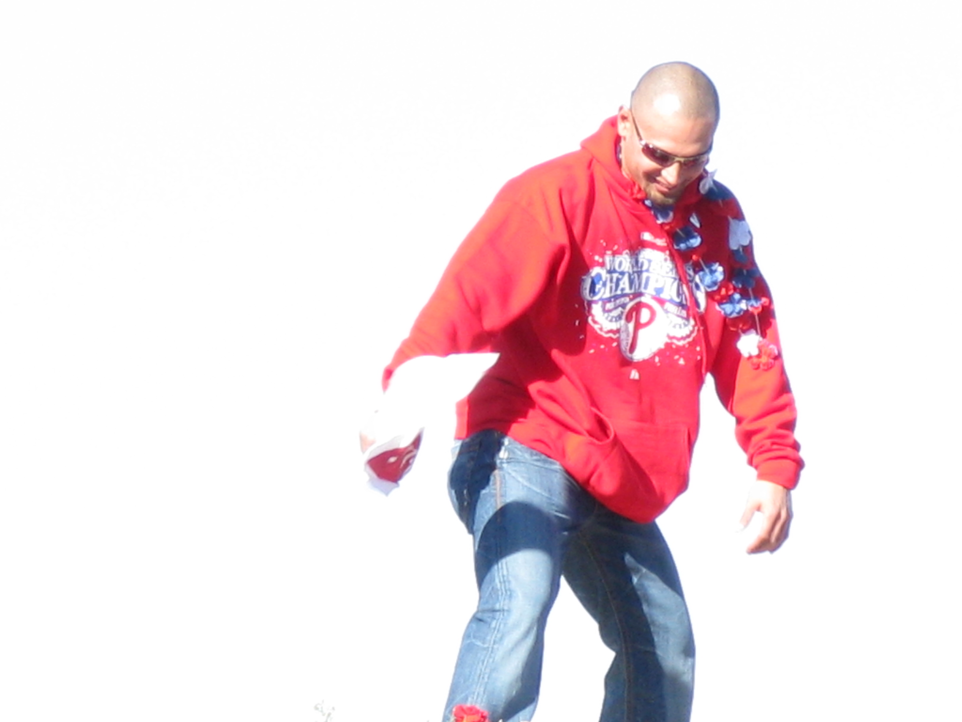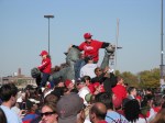 I love Halloween. The candy, the costumes, the customs. I think one of the reasons I’m so big into Halloween these days is because I never seemed to enjoy it when I was younger. I always picked a costume with a mask, like Batman or the Riddler. The one year, I dressed up in a homemade British Bulldog Davey Boy Smith outfit, complete with sparkly cape and overblown chest plate. But I didn’t really like it. But now, now I love it. This year, I willingly gave it up though. On Thursday, October 30, Katie and I traveled from Penn Station to her home in Burlington, NJ. After she pried me away from Rock Band 2 long enough, we picked up Dan in Allentown. Yesterday, we were among the 2 million who helped usher in the 2008 World Series Champion Philadelphia Phillies back to Citizens Bank Park.