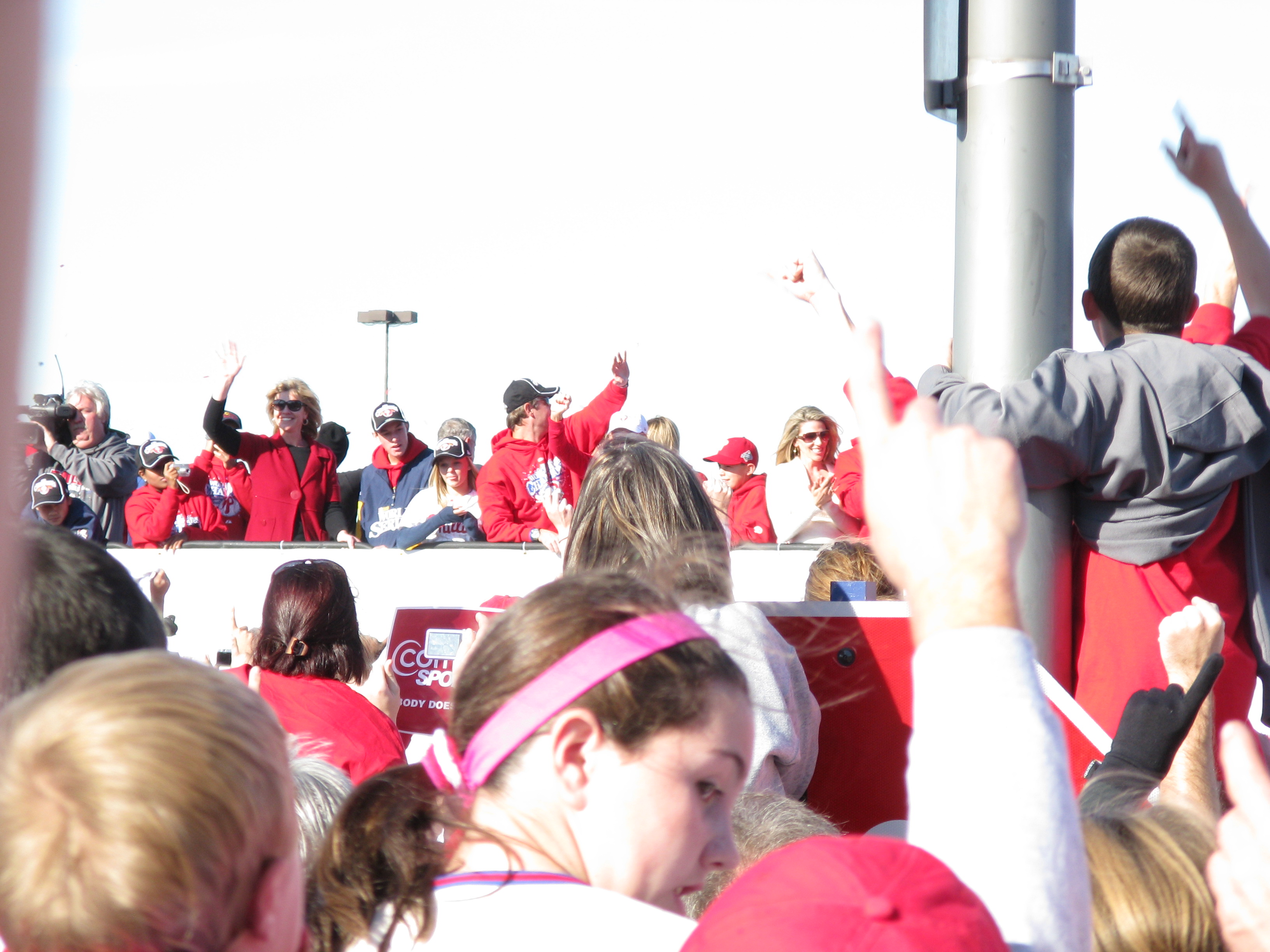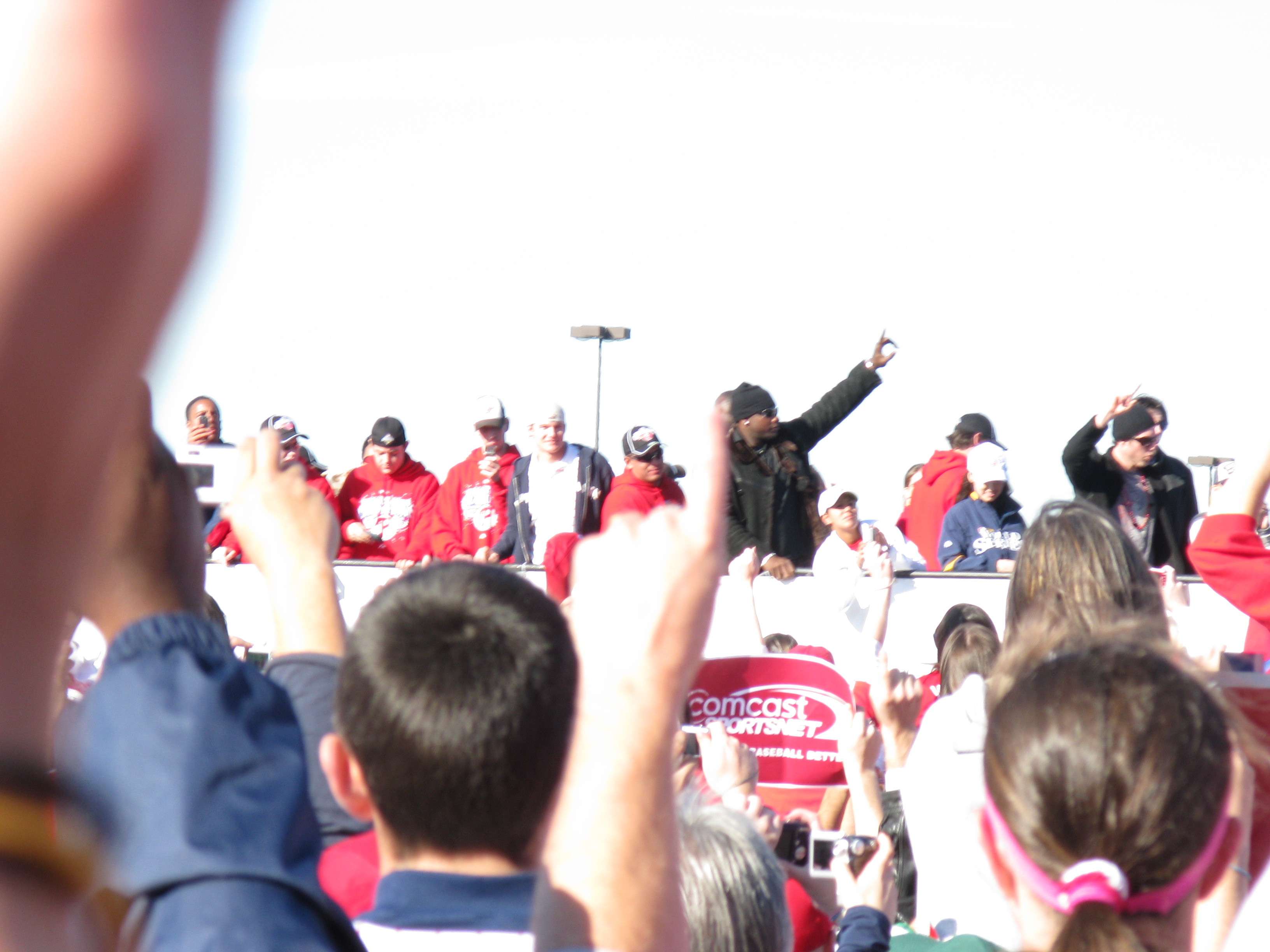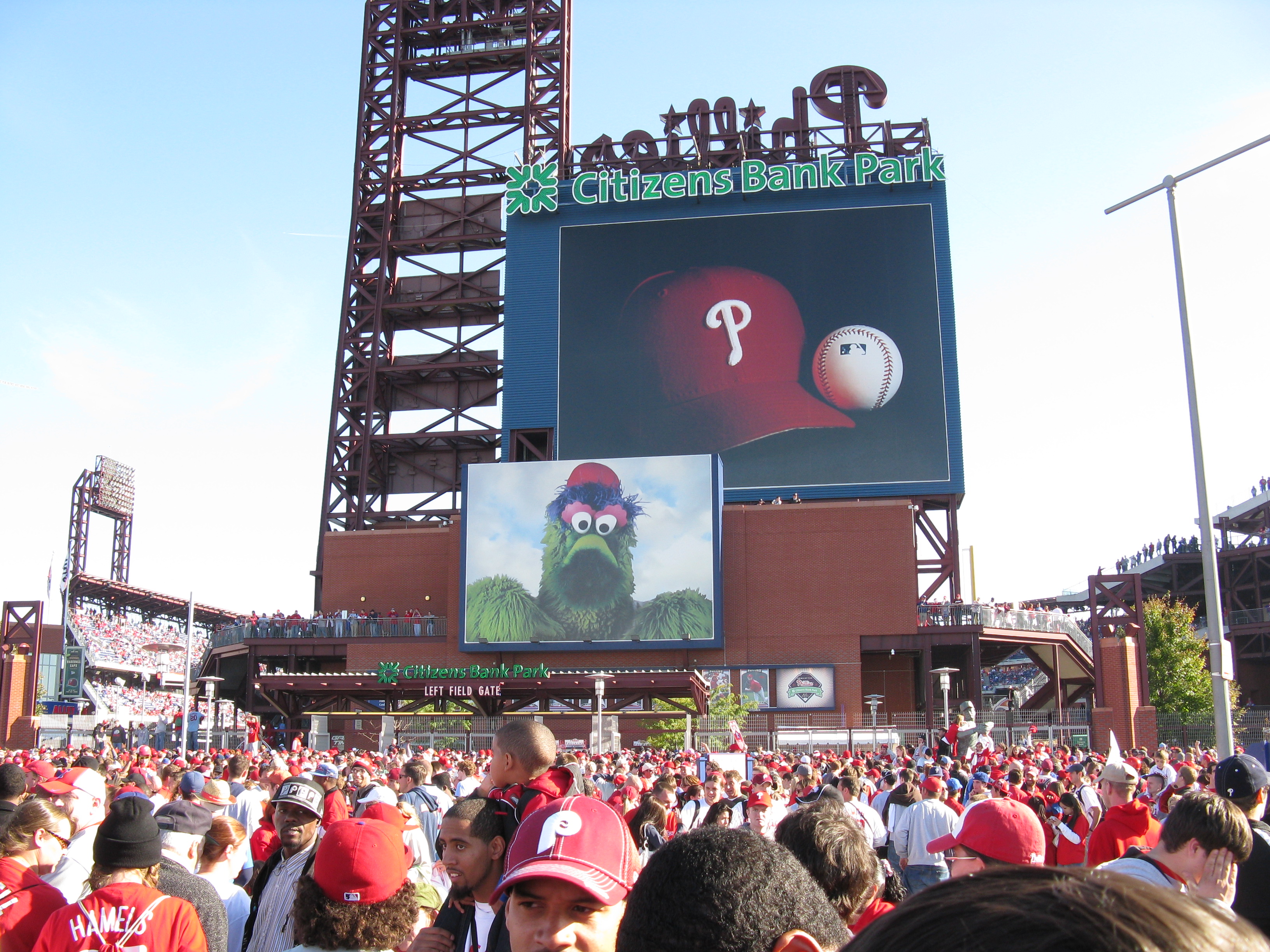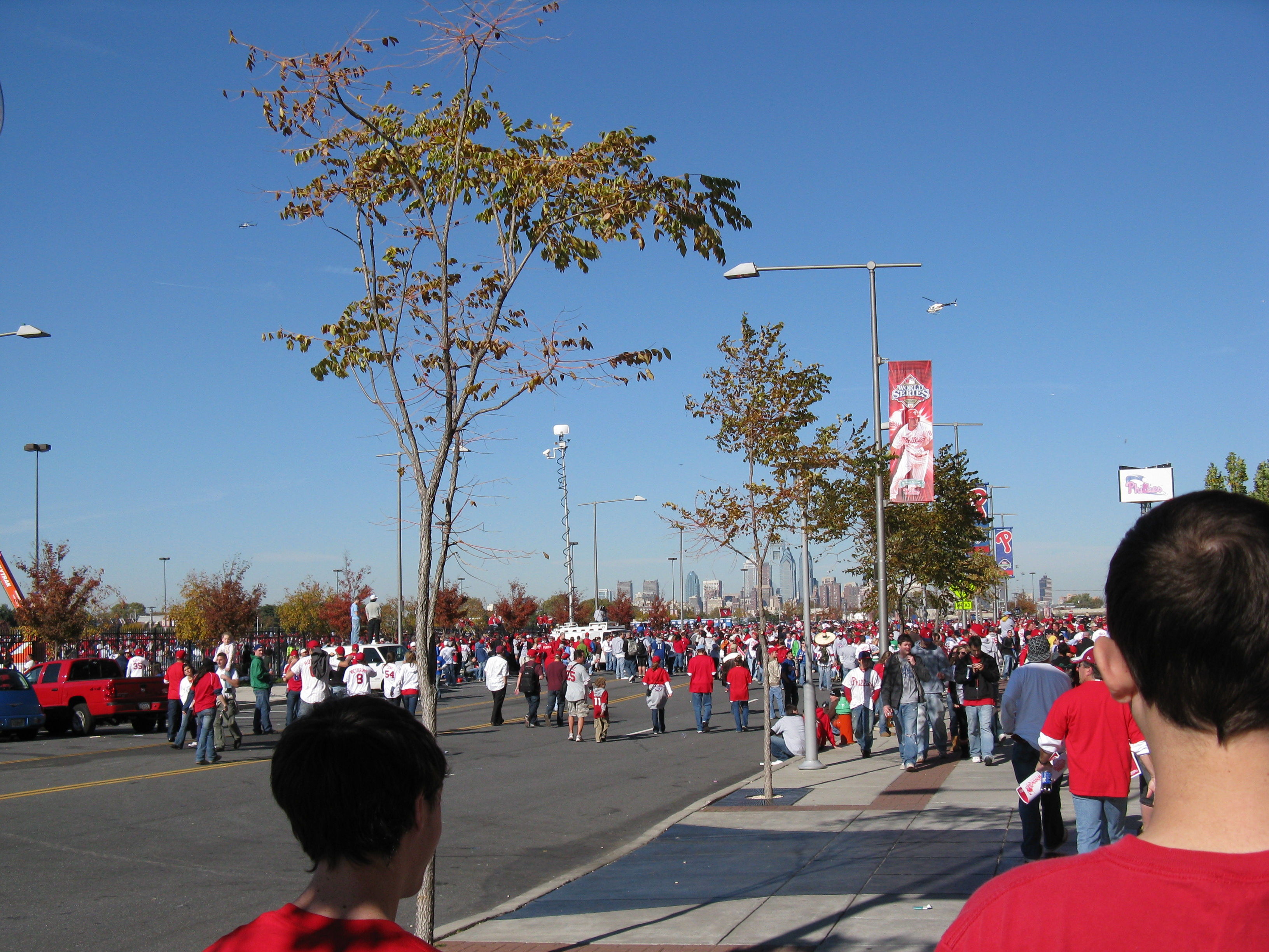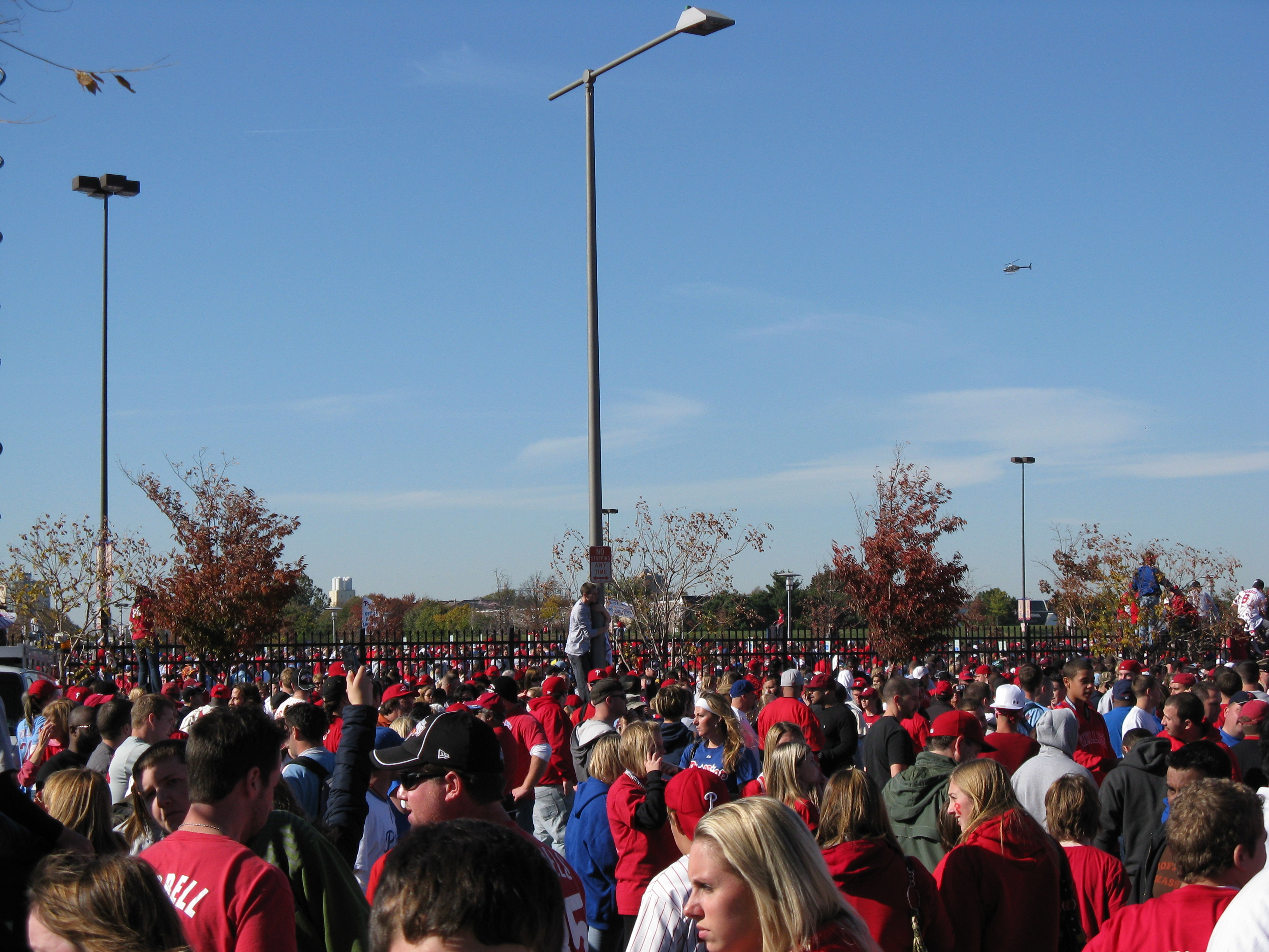 I love Halloween. The candy, the costumes, the customs. I think one of the reasons I’m so big into Halloween these days is because I never seemed to enjoy it when I was younger. I always picked a costume with a mask, like Batman or the Riddler. The one year, I dressed up in a homemade British Bulldog Davey Boy Smith outfit, complete with sparkly cape and overblown chest plate. But I didn’t really like it. But now, now I love it. This year, I willingly gave it up though. On Thursday, October 30, Katie and I traveled from Penn Station to her home in Burlington, NJ. After she pried me away from Rock Band 2 long enough, we picked up Dan in Allentown. Yesterday, we were among the 2 million who helped usher in the 2008 World Series Champion Philadelphia Phillies back to Citizens Bank Park.