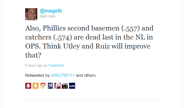 That’s right: the Phillies currently have a .666 winning percentage, and the best record in the Majors, despite getting the lowest production in the league from second base and catcher. Ruiz and Utley cannot return soon enough.