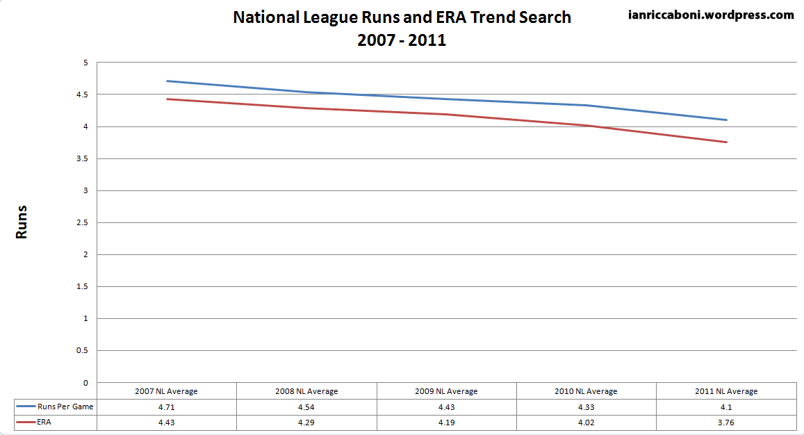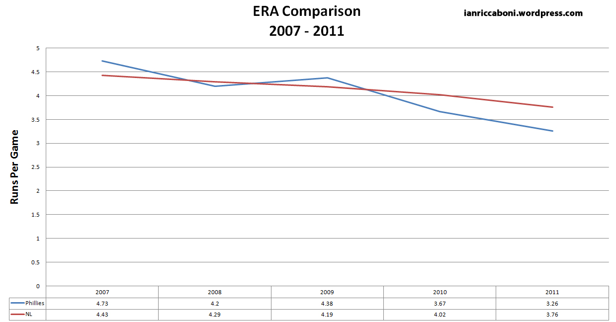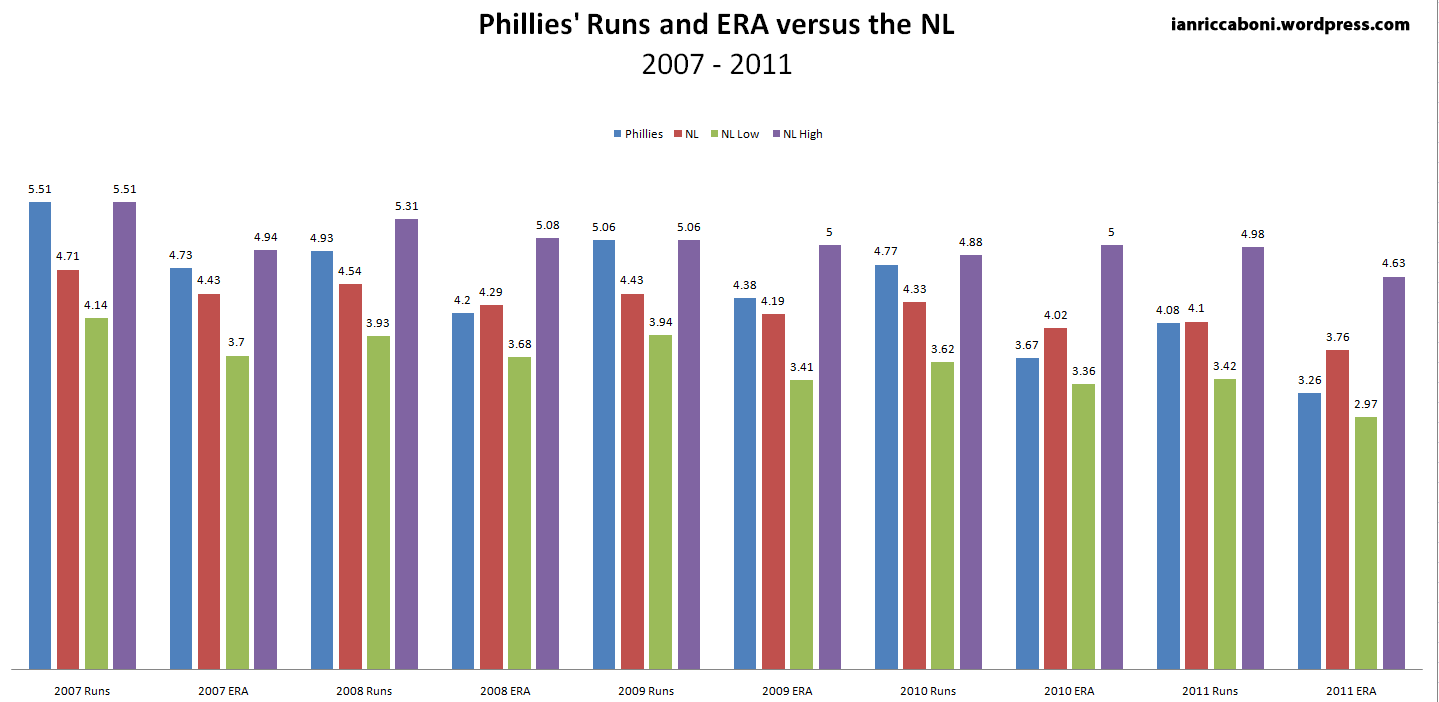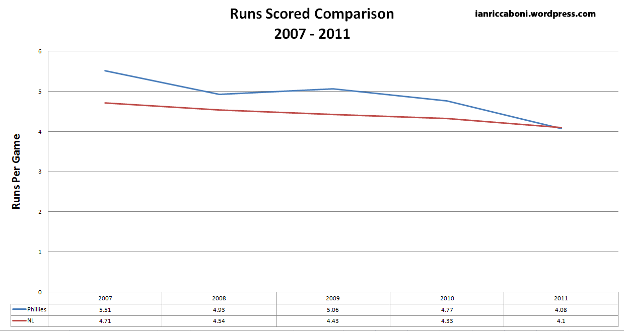 The Phillies had a Runs v. NL Average Runs differential of (.8, .39, .63, .42, -.02) from 2007-2011. The striking number, and the outlier, is the -.02. It is the only negative and a stark drop-off from the mighty run scoring teams of 2007 and 2009 and a .4 runs per game less than the differential they were putting up against the NL from 2010. The good news, and perhaps more obvious number when looking at the above graph is that the Phillies’ pitching has improved leaps and bounds since 2007. In 2007 and 2009, they needed the offensive outburst, being outpaced by the league average by -.3 and -.19 earned runs per game. In 2008, they were only .09 earned runs above the league average per game. It should come as no surprise that in 2010, a year they won 97 games, they outpaced the NL average in earned runs per game by .35. This year? They are outpacing the league average by a full half run per game.This number becomes very important in a series of discussion points that may become very confusing.