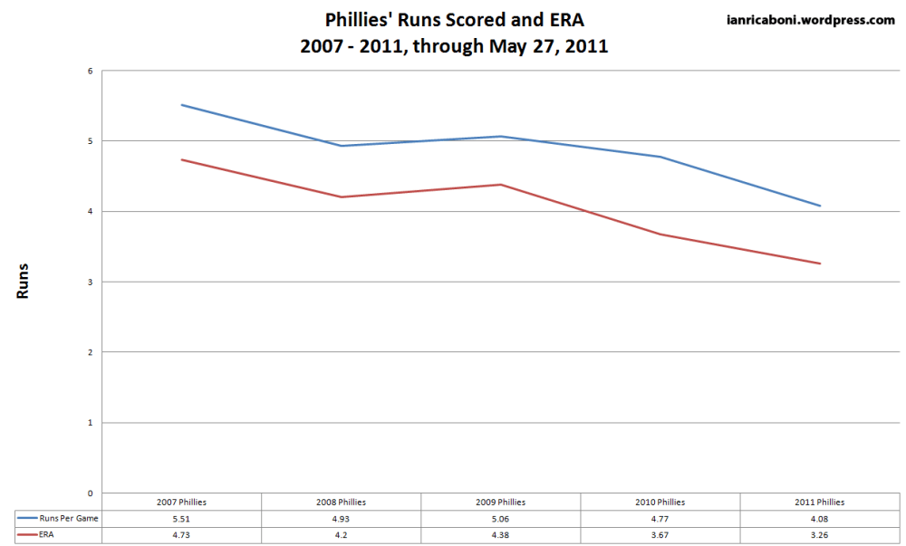 To make things simpler, compare the chart above to the one below, that of the Phillies’ runs scored and ERA. Look awfully similar, don’t they?