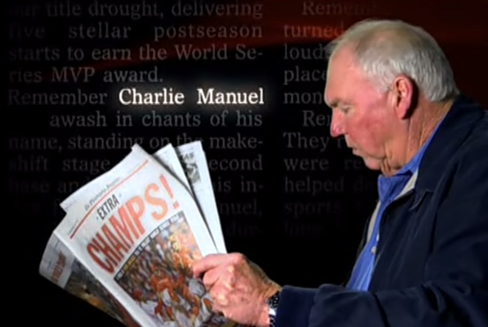 I love Charlie Manuel and think he’s a great manager but for whatever reason, Chuck in a suit reading the newspaper with his name flashing on the screen made me laugh hysterically while trying to find things I may have forgotten about the 2008 season.