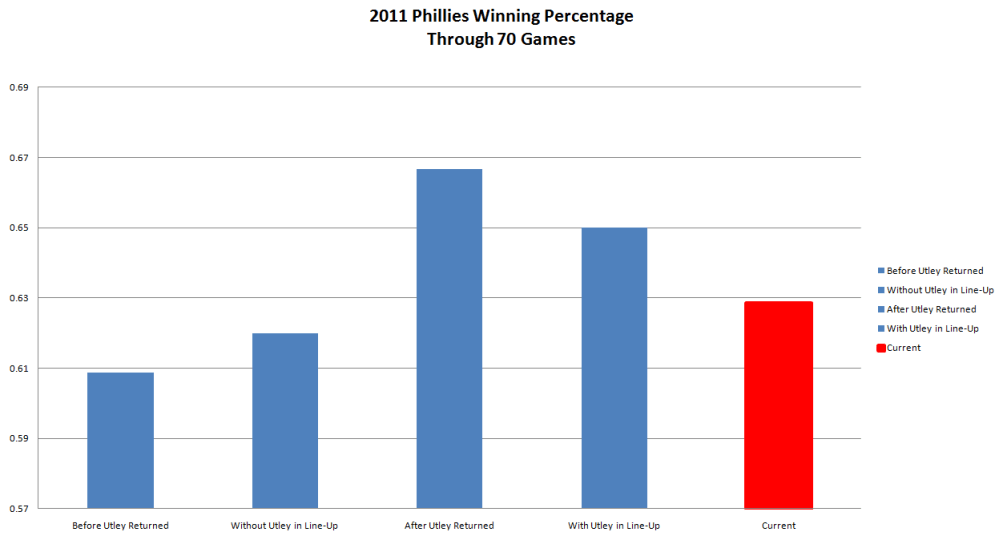 Chase returned on Monday May 23, 2011 against the Cincinnati Reds, going 0-5 with a strikeout in a 10-3 Phils win. He followed it up with a 1-4 night, a day off, and a 1-5 night, putting him at 2-14 to start his season. But since his return, the Phils have caught fire, posting a 16-8 record including their active 7-game winning streak. Undoubtedly, the Phils have benefited from having the three top pitchers in the league in xFIP (Halladay, Hamels, and Lee), but Utley’s .8 WAR in just 21 games out-paces replacements Wilson Valdez at -0.7 and Michael Martinez at -0.3, adding somewhere between 2 and 2.4 wins immediately to the Phils if adjusted for playing time.
