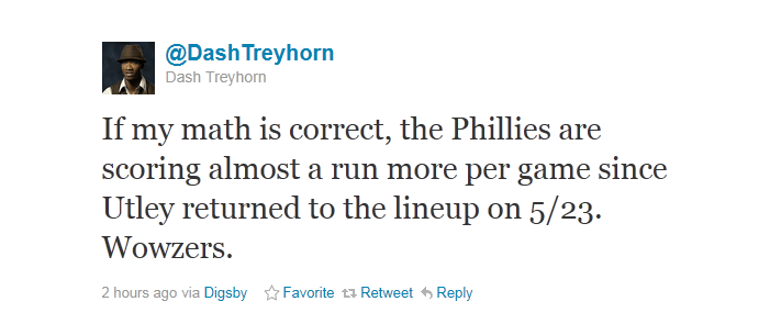 Update: Saw Dash’s Tweet at about 12:30 PM when I stepped away from lunch. Did not see that he had posted an article very similar to mine an hour before I did. Dash’s is a little less optimistic, and honestly, more responsible in his assessment that it is all not Utley. The Phils have had great pitching and Valdez and Martinez are obviously not MLB starting second basemen material, but Utley has definitely had an impact in a small sample size.