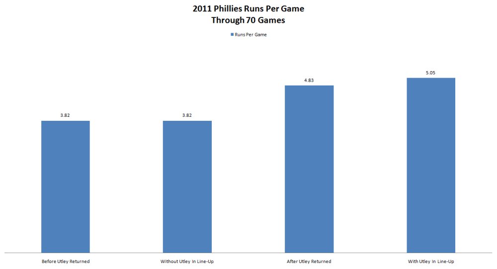 Below are some graphical illustrations of the Phillies’ offensive success since Utley’s return. They’ve won 16 of 24 since his return, 13 of 20 when Utley starts, have scored a full run more per game since his return, and score 1.2 more runs per game with Utley in the line-up. Click each graph to expand.