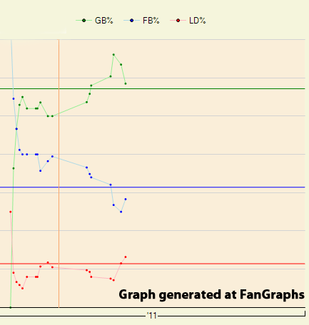 Returning to ground balls, Herndon’s improvement directly coincided with the amount of ground balls he was able to induce, as seen here in the this graph generated by the awesome Fan Graphs: