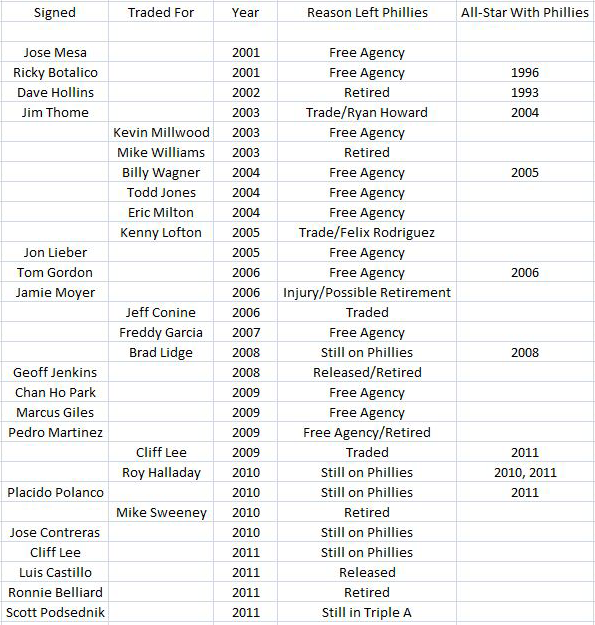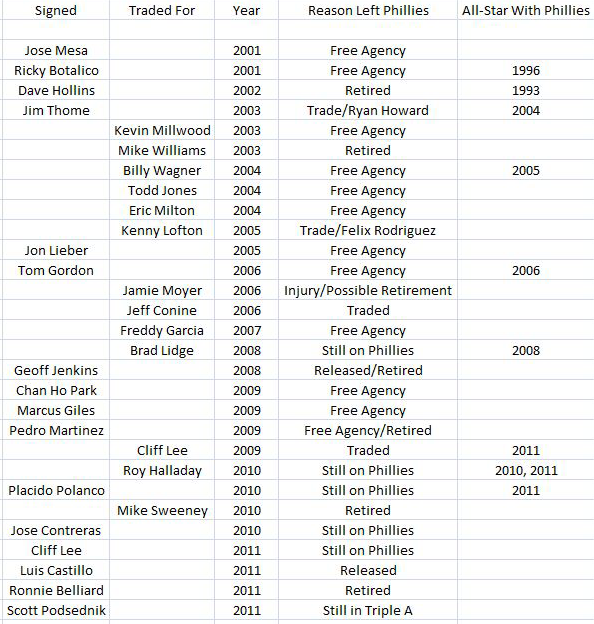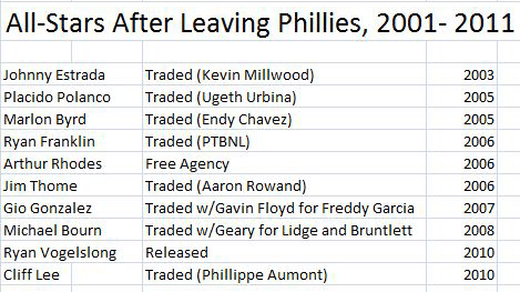 For instance, the acquisition of Freddy Garcia cost the Phillies two pitchers who have pitched well in the past few seasons: Gavin Floyd and Gio Gonzalez. Gonzalez is headed to his first All-Star game this year after being incredibly effective for the Oakland Athletics. He is one of eight players that the Phillies have either traded or released from 2001-2011 that have made the All-Star game after departing the Phils (click to enlarge):