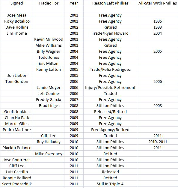 Of the 29 former All-Stars acquired, only 7 made the All-Star team with the Phillies after being acquired while both Dave Hollins and Ricky Botalico had previously made the All-Star team with the Phillies and were later reacquired. Of the players acquired, only a few were reasonably expected to be All-Stars. The Phillies got as-advertised players with Halladay, Lee, Jim Thome, Brad Lidge, and Billy Wagner, while Tom Gordon was a bit of a pleasant surprise. While Jose Mesa did not make the All-Star team with the Phillies after being acquired, he pitched very well as the Phillies’ closer. Jose Contreras has exceeded expectations and has been excellent out of the bullpen and Jamie Moyer was a pivotal part of the Phillies’ transformation into a World Series club. Some of the players acquired, including but not limited to Ronnie Belliard, Luis Castillo, Mike Sweeney, and Jeff Conine were no-harm, no-foul acquisitions while others cost the Phillies players who would mature into top talent.