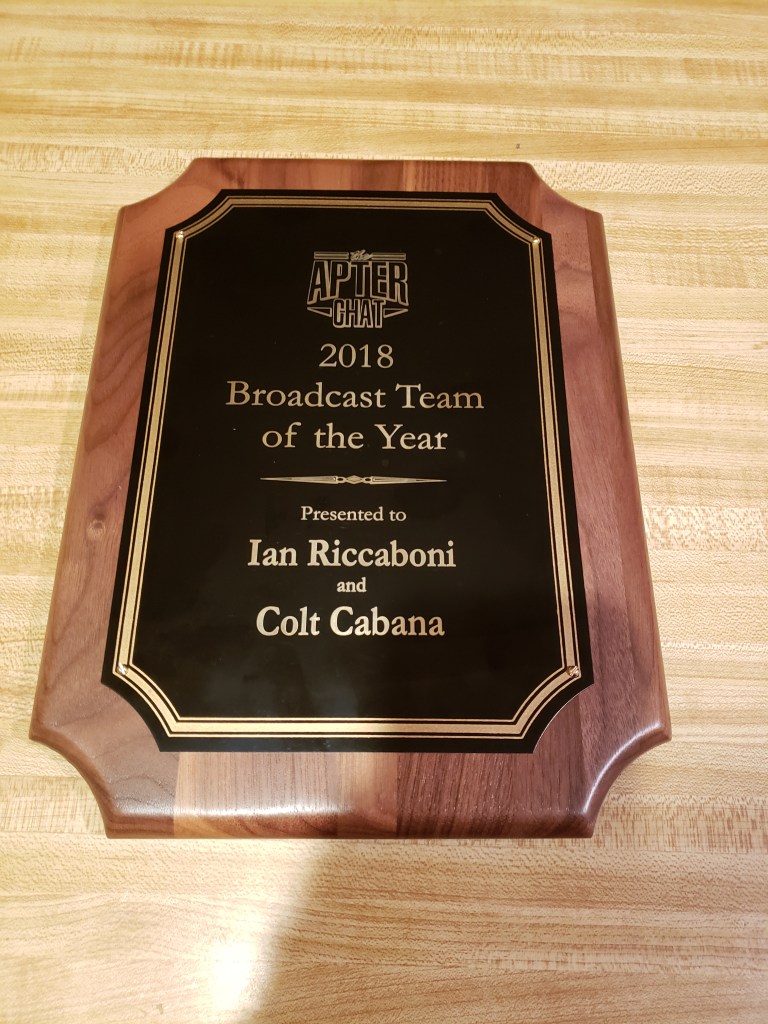 So it was a great thrill on Saturday night to be recognized by “Wonderful Willie” and his Apter Chat podcast co-host Josh Shernoff as the Commentary Team of the Year with Colt Cabana!